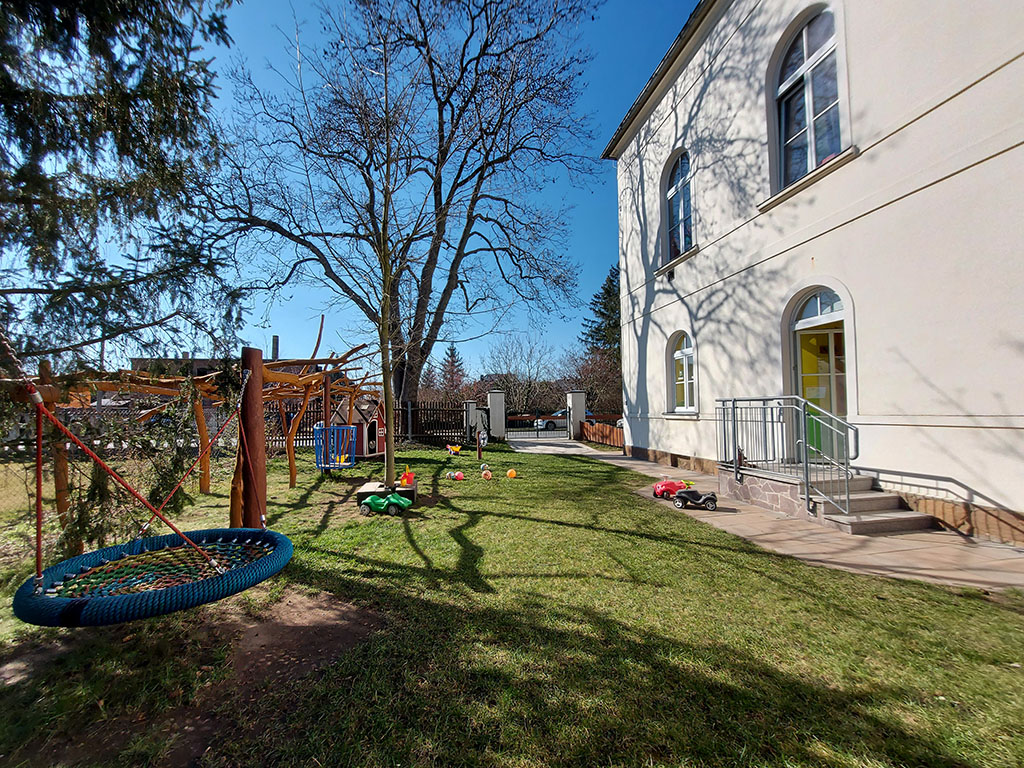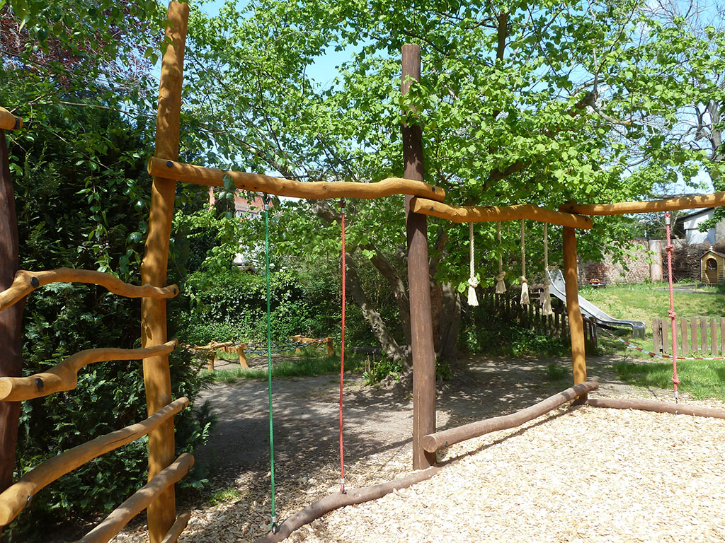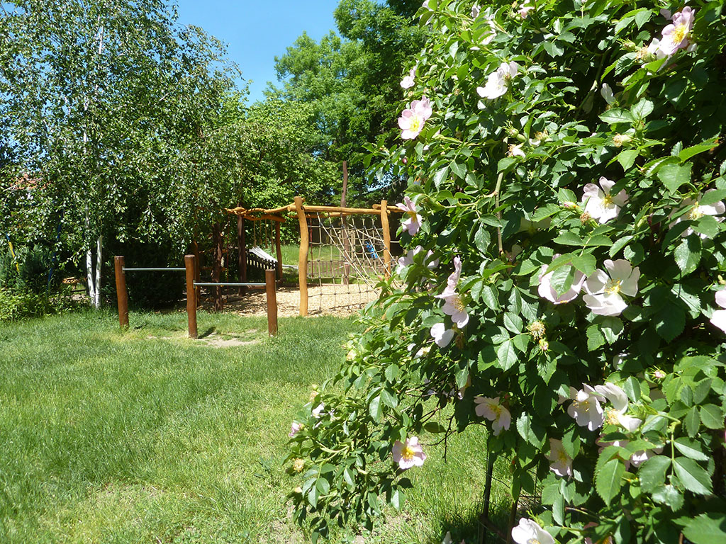 Besonders schön ist unser weiträumiges Gartengelände mit vielen Bäumen, Stauden und großen Wiesen. Alle Spielgeräte wurden aus wertvollem Robinienholz gestaltet. Eine große Doppelschaukel, Klettergerüste, ein Balancierparcours, große und kleine Rutschen, Sandkästen und die große Arche laden zum Bewegen, Agieren, Spielen und sich Ausprobieren ein.